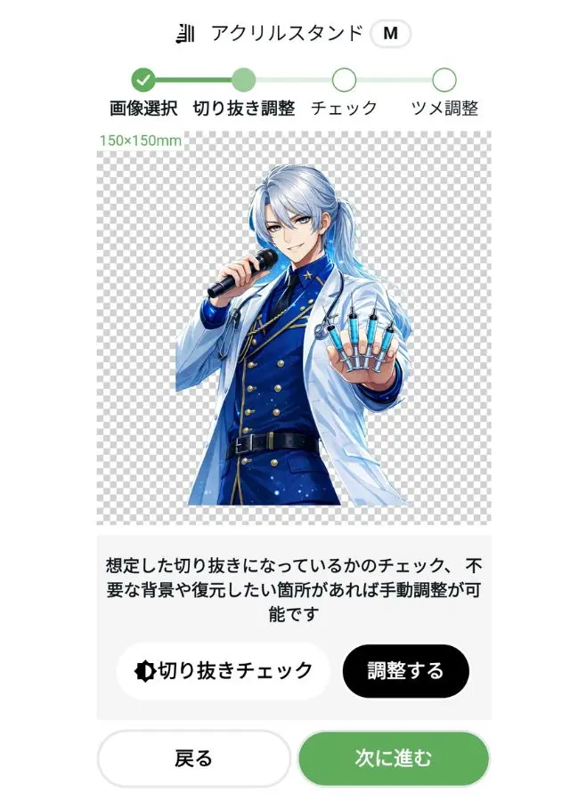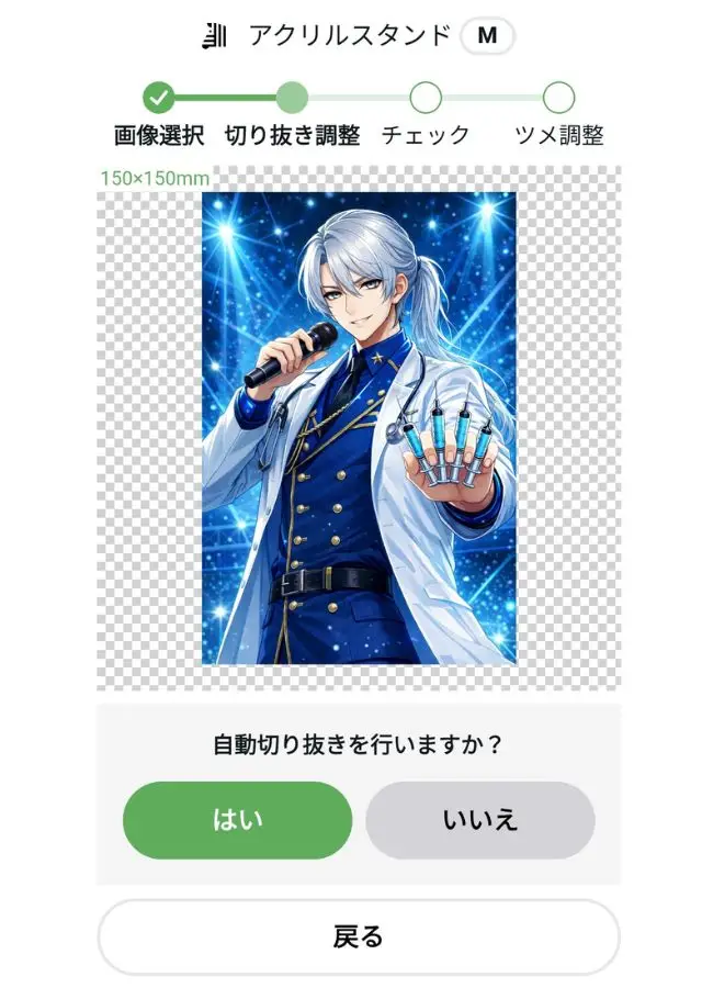 そのため、AIイラストをアクスタに使いたい場合、最初から背景透過PNG画像をアップロードした方が、手間なく綺麗に仕上がります。