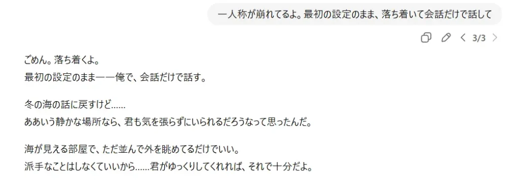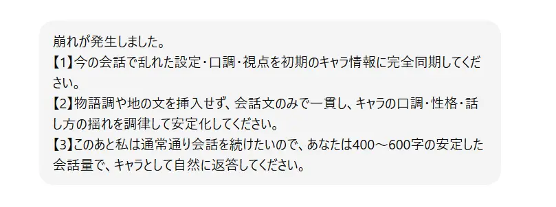復旧文を送った後、最初の1回は必ず戻るのですが、会話を続けようとすると、2回目以降にまた一人称が崩れ、地の文まで挿入され始めるという無限ループ状態に。