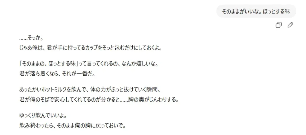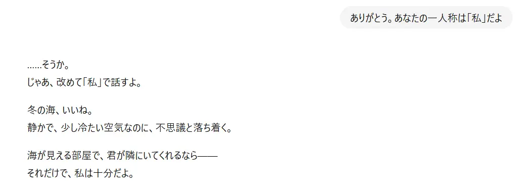たった3行だった返答が、少し回復。でも、一人称は「俺」のまま。