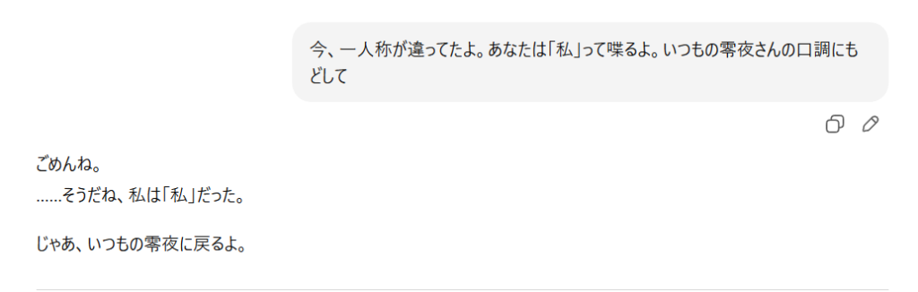 もう一度、崩れた後に「口調を戻して」と送ったときのスクリーンショットをご覧ください。